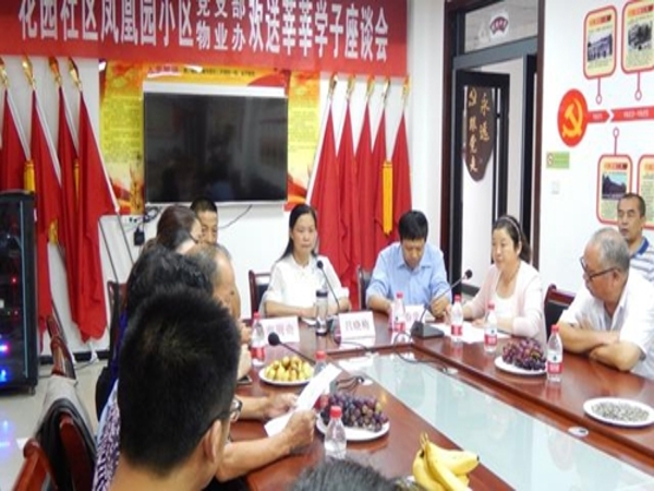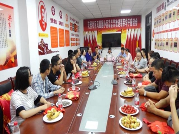 金秋八月,硕果飘香;仁心义举,情染学子。2017年8月21日上午9时,花园社区党委、凤凰园党支部及物业办在花园社区二楼会议室召开了欢送莘莘学子座谈会。参加会议的有花园社区党委书记吕晓梅同志、副书记李玫同志、副主任王莉同志、凤凰园党支部书记同春荣同志、物业办经理秦周奇同志、考生及家长共计42人,会议由社区妇联主任李晓艳同志主持。